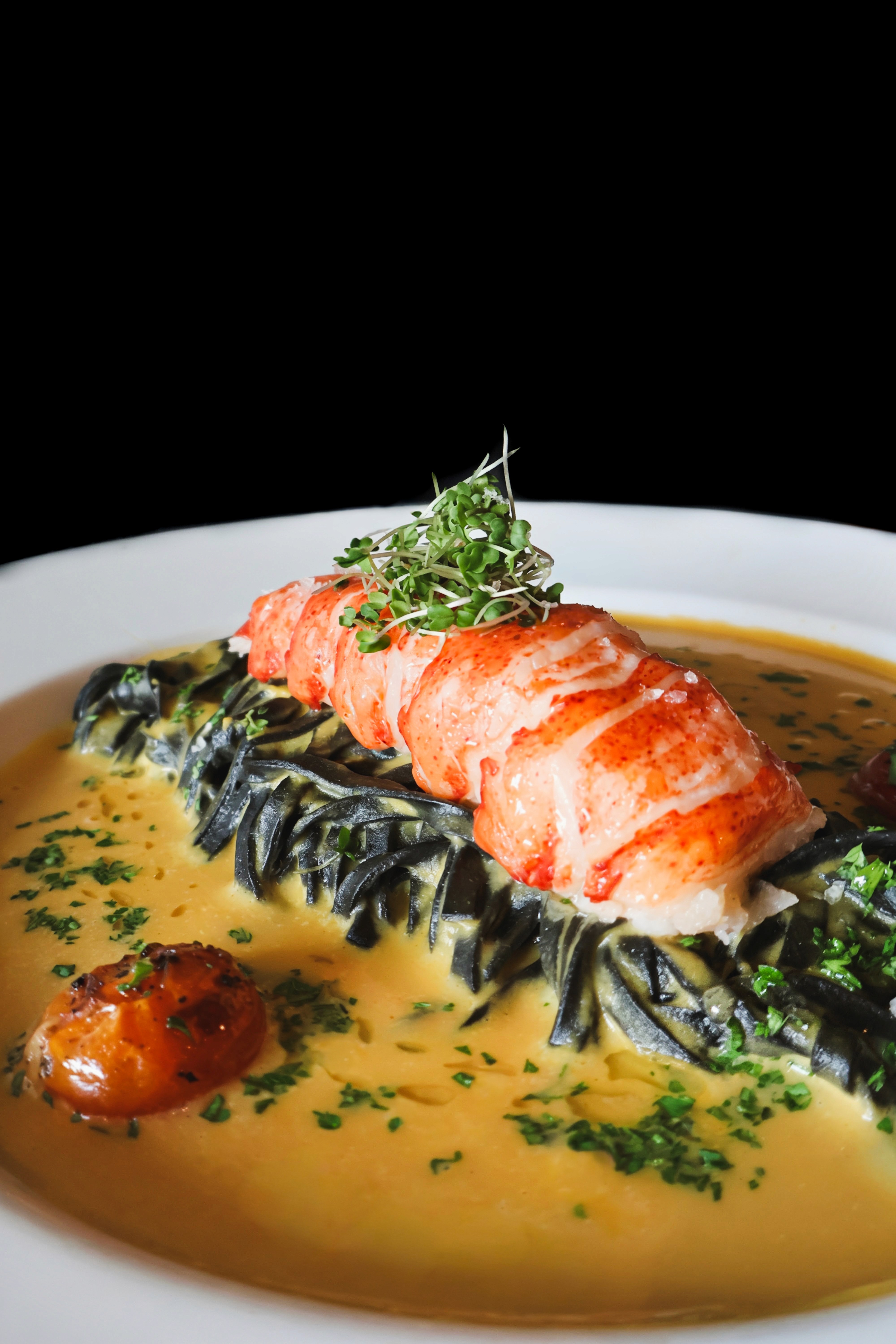 Butter Poached Lobster Tail. Squid Ink Linguine. Lobster Bisque